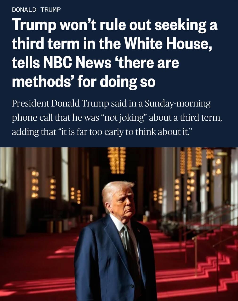 Обрання президента на більш ніж два терміни заборонено Конституцією США. Водночас Трамп заявив, що "не жартує" щодо такої можливості.