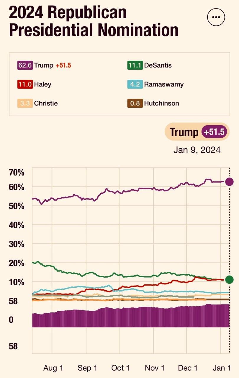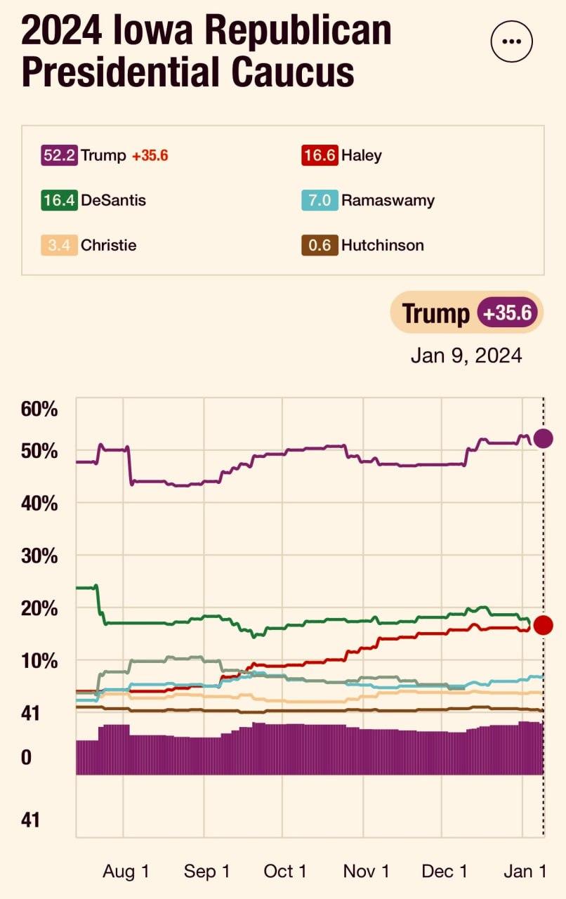 На першому малюнку рейтинги претендентів в Айові, на другому - у всіх США. Видно, що головна інтрига – боротьба за друге місце між Хейлі та ДеСантісом.