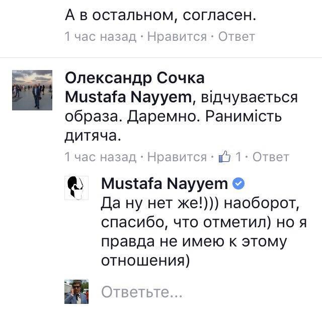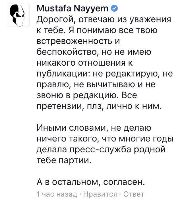 Колезі депутату відповів Mустафа Найєм і навіть погодився щодо змісту статті. У коментарі до цього посту він написав: "Дорогой, отвечаю из уважения к тебе. Я понимаю все твою встревоженность и беспокойство, но не имею никакого отношения к публикации: не редактирую, не правлю, не вычитываю и не звоню в редакцию. Все претензии, плз, лично к ним. Иными словами, не делаю ничего такого, что многие годы делала пресс-служба родной тебе партии. А в остальном, согласен".