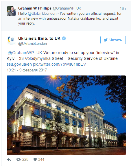 Посольство Украины в Великобритании тонко "потроллило" скандального прокремлевского пропагандиста Грэма Филлипса. Ранее Филлипс через Twitter подал запрос в посольство на проведение интервью с Натальей Галибаренко.