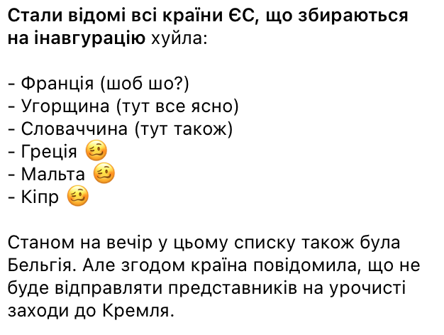 Тим часом багато інших членів ЄС, у тому числі Німеччина, вирішили відмовитися від участі в інавгурації Путіна.