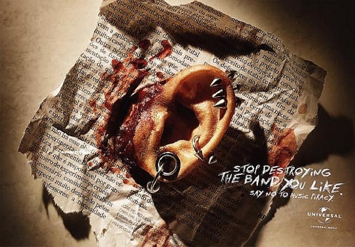 Корпорация Universal Music продолжает бороться с пиратством, на этот раз - с помощью жуткой рекламной кампании. Бразильское подразделение Saatchi & Saatchi разработало принты, на которых изображены останки музыкантов, якобы «убитых» нелегальным прослушиванием их музыки.