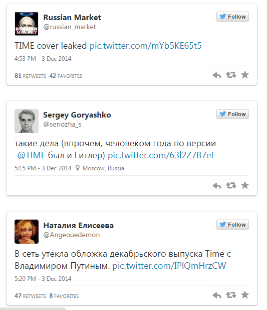 Обновление на 10:40 4 декабря: обложку Time без предположений о том, что она может быть поддельной, показали в эфире федерального телеканала НТВ. С аналогичными материалами выступили «Дни.ру» и «Ридус».