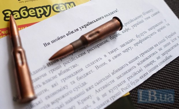 Во вторник в Киеве состоялась акция, во время которой посетителям ресторана, который входит в российскую сеть, активисты раздавали муляжи патронов.