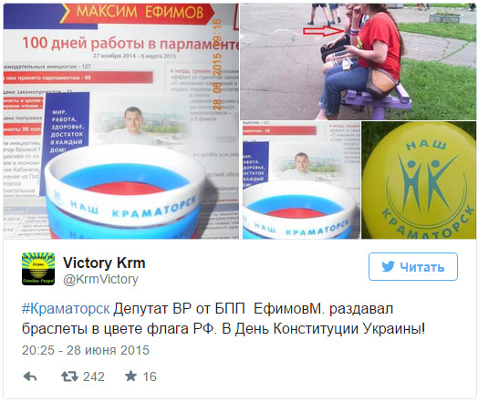Браслеты раздавали волонтеры общественной организации Наш Краматорск, созданной по инициативе народного депутата от Блока Петра Порошенко Максима Ефимова, бывшего регионала, пишет Новое время.