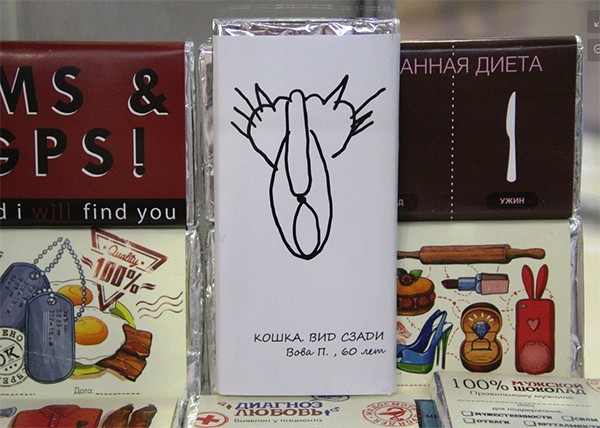 Нещодавно малюнок Путіна надрукували на обкладинках російський солодощів, пише Znak.com. Вигадливі виробники навіть кумедно підписали обгортку: "Кішка. Вид ззаду. Вова П., 60 років".