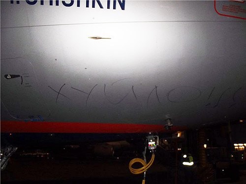 Напис намагалися затерти, але зробити це повністю не встигли, так що літак відбув до місця призначення з частиною відомої кричалки "Путін - ... йло".