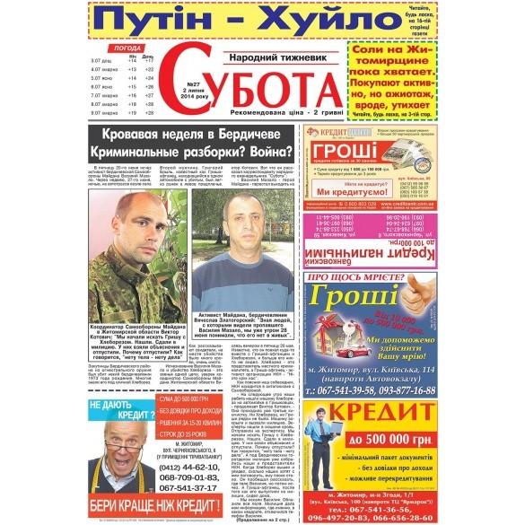 Одна з найпопулярніших газет Житомира "Субота" сьогодні у світ вийшла під заголовком "Путін х*йло". Назва великими літерами майорить на титульній сторінці видання.