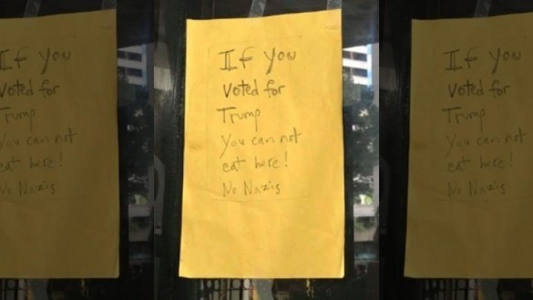 На скляних дверях власники почепили яскраво-жовтий стікер із написом: "Якщо ви голосували за Трампа, ви не можете їсти тут! Жодних нацистів".