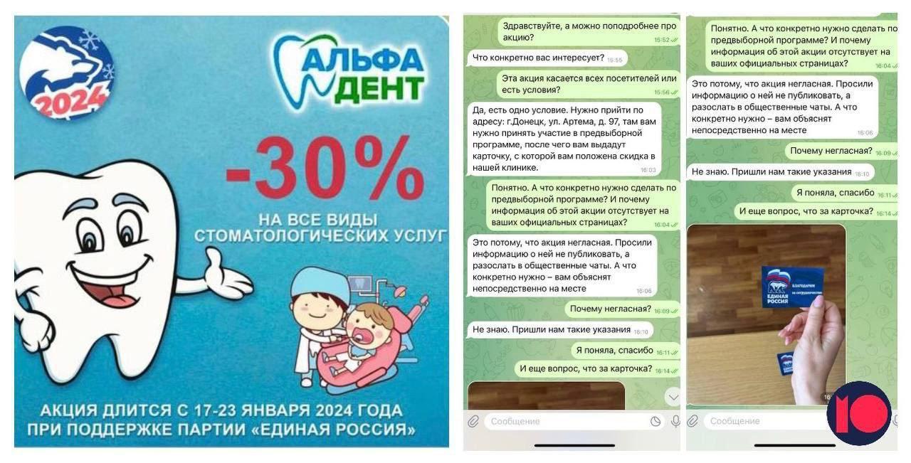 Так, в окупованому Донецьку заманюють поставити підпис за висування Путіна в президенти. Оголошення про акцію з'явилося у чаті мешканців: «30% на всі види стоматологічних послуг. Акція триває з 17-23 січня 2024 року за підтримки партії "Єдина Росія"».