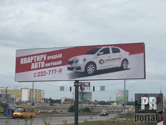 Рекламщики будівельної компанії "Синергія" в пошуках креативу дійшли до плагіату. Нова рекламна кампанія виконана у стилі виборчії кампанії Петра Порошенка. Правда, замість слогану "жити по-новому" по діагоналі написано: "Квартиру придбай, авто вигравай!"