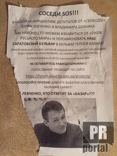 Про наближення виборів свідчить не лише реклама депутата-антикорупціонера Віктора Чумака, а й чорна PR-кампанія проти народного депутата України від ВО "Свобода" Юрія Левченка. Як повідомляє PRпортал проти народного обранця у Києві почали розповсюджувати листівки в яких він ніби-то обіцяв перейменувати Соратовський бульвар на бульвар Героїв базара. Автори листівки питають: "Левченко, кто ответит за базар???"