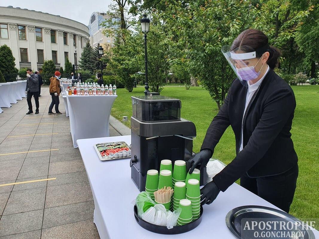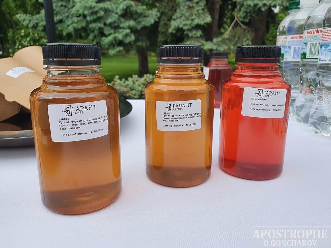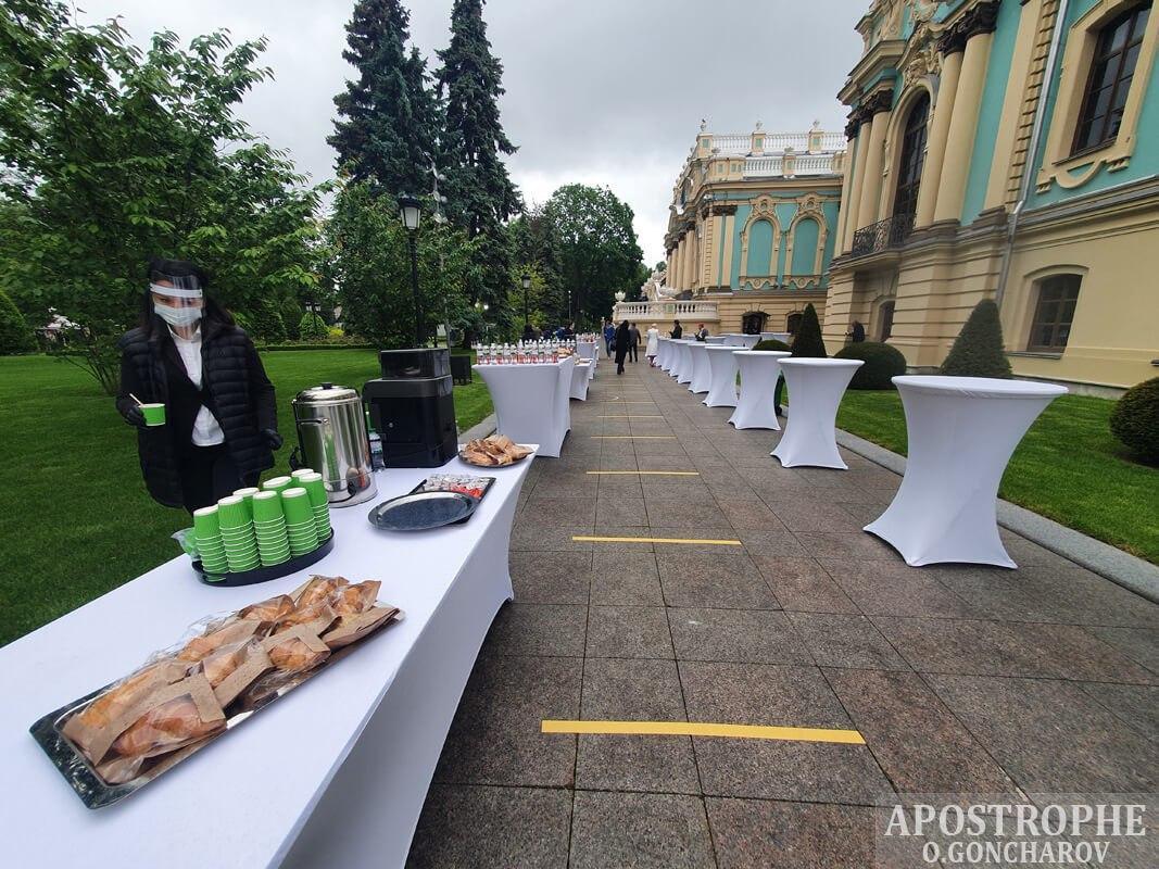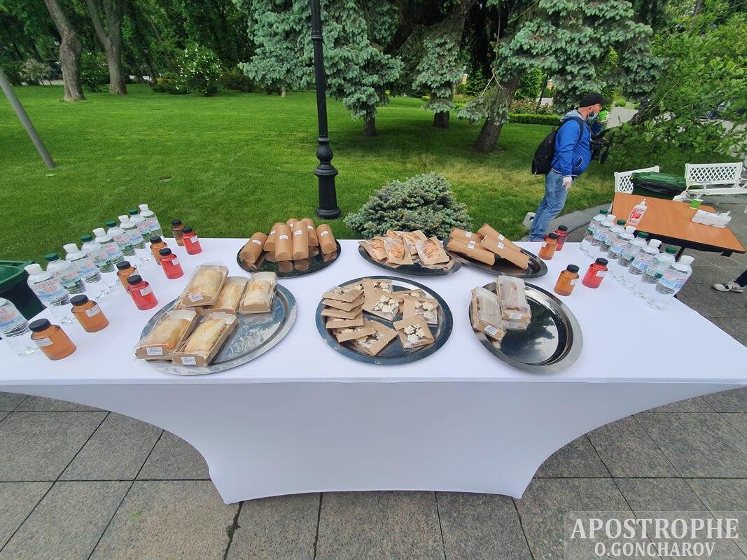 Журналістам пропонують круасани і узвар. Продукти харчування й напої запаковані в індивідуальні упаковки.