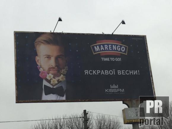 Лікер "Маренго" оригінально привітав жінок з початком весни. На борді розмістили чоловіка, бороду якого прикрасили квітами, - повідомляє PRпортал.