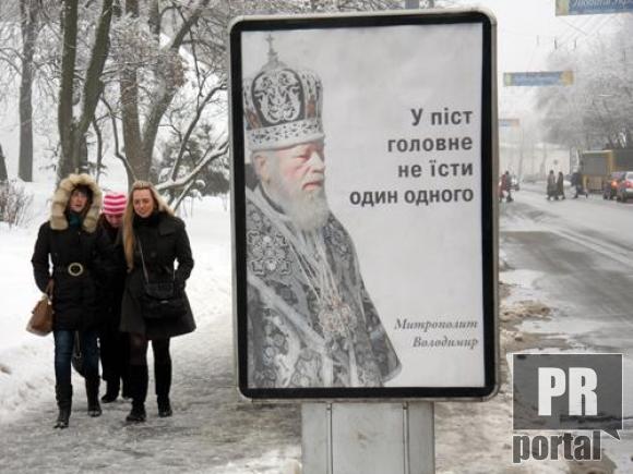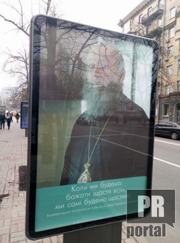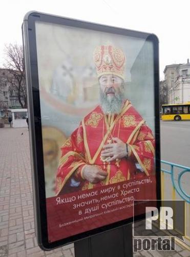 На іншому рекламному носії предстроятель УПЦ говорить: "якщо немає миру в суспільстві, значить, немає Христа в душі суспільства"