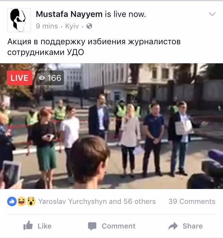 Народний депутат Мустафа Найєм на власній сторінці у Фейсбук транслював акцію активістів проти нападу співробітників УДО на журналістів, проте помилився в дописі до трансляції.