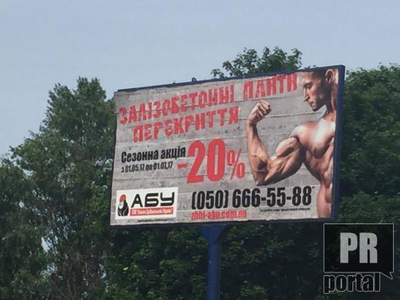 Як повідомив PRпортал, оголений чоловічий торс рекламує житловий комплекс під Києвом, напівоголена дівчина у Вишневому, що під Києвом, рекламує металобазу. А в Тернополі жіночі ноги, рекламують бруківку