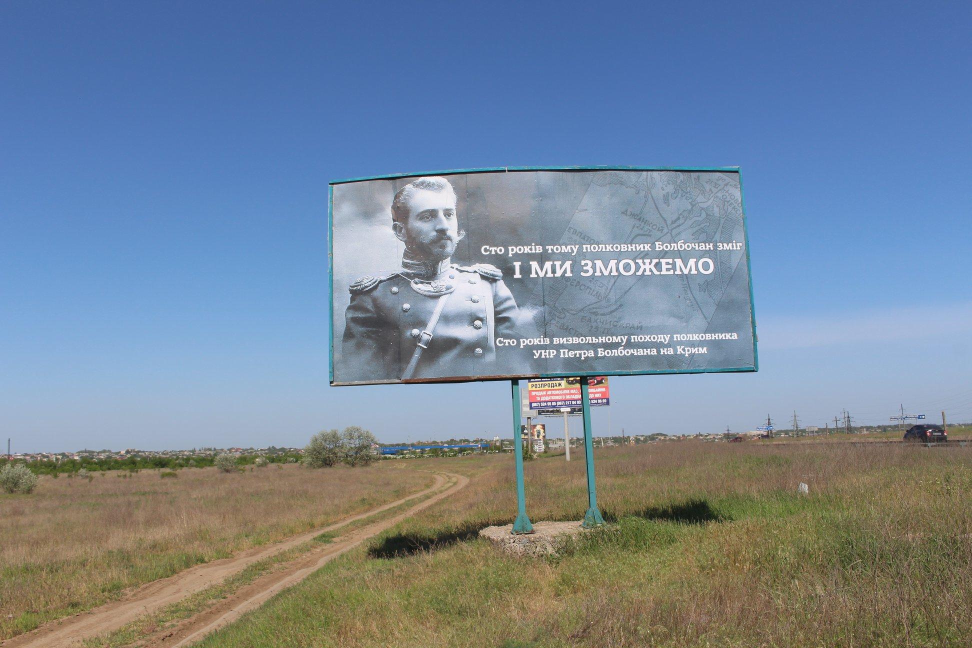 Волонтери розмістили 20 бордів, присвячених визвольному походу полковника Петра Болбочана на Крим. Бігборди розмістили біля адмінкордону з окупованим Кримом.