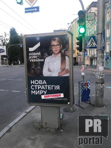 Невідомі творчо відредагували сітілайти Юлії Тимошенко на яких вона обіцяє "нову стратегію миру". На рекламних носіях з'явилася наліпка "капітуляція". Відповідне фото PRпортал отримав на редакційну пошту.