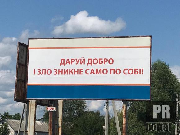 На трасі Київ-Ковель, поблизу Бородянки, встановлено кілька "оптимістичних" бордів. Як повідомляє PRпортал, на них написано: "Даруй добро і зло зникне само по собі!"