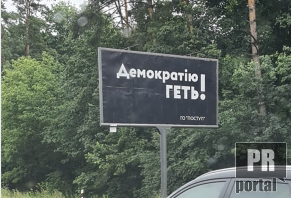На в’їзді до Києва вимагають «Деморатію, Геть!». Як інформує PRпортал, автором борду вказана ГО «Поступ».