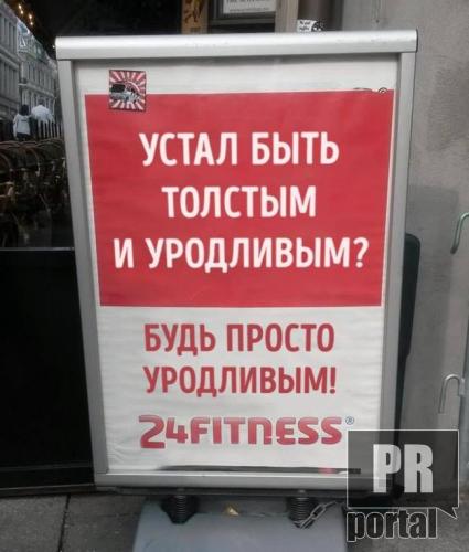 "Устал быть толстым и уродливым? Буть просто уродливым!", - такой оригинальный слоган избрал для себя спортзал 24firness. Об этом сообщает PRпортал