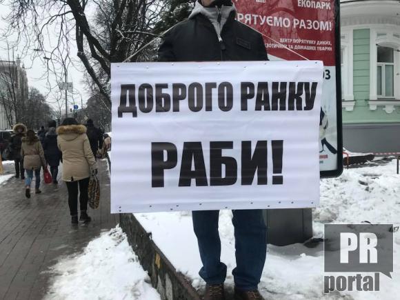 Під Верховною Радою пройшов одиничний пікет. Чоловік тримав плакат на якому написано "Доброго ранку, раби!"