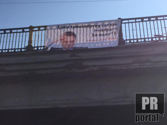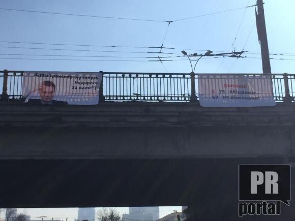 На одному з них розміщено фото міністра та слоган:" Здам транспортну галузь. Не дорого. За валюту". На іншому банері написано: "Омелян! З 71 обінянки - 57 не виконано"