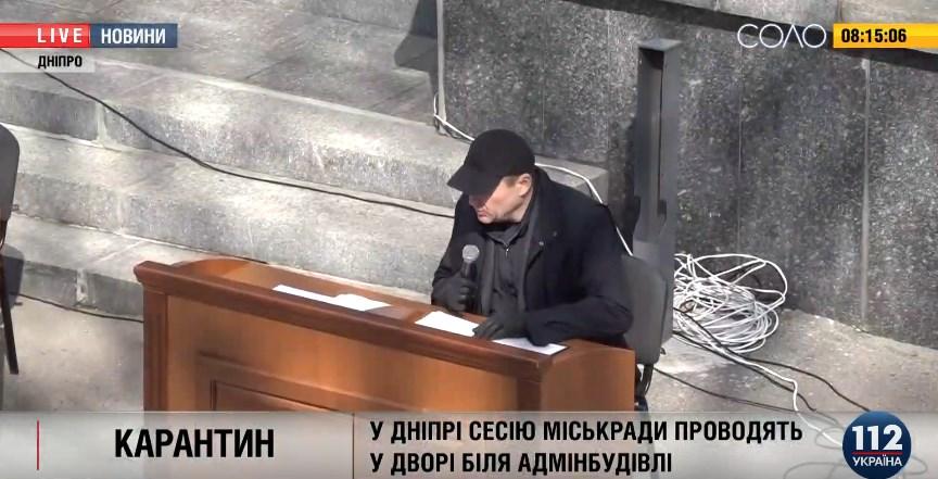 У Дніпрі депутати міської ради зібралися на сесію у дворі будівлі міськради. Депутати ухвалили зміни до регламенту роботи міської ради, що дозволяє проводити онлайн сесії на період карантину.