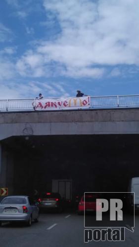 У Києві на мосту біля річкового вокзалу з'явився банер зі словом "Дякуємо!" з брендованою буквою М, котра характерна для мережі McDonald's. Як інформує PRпортал активісти дякували за українську мову