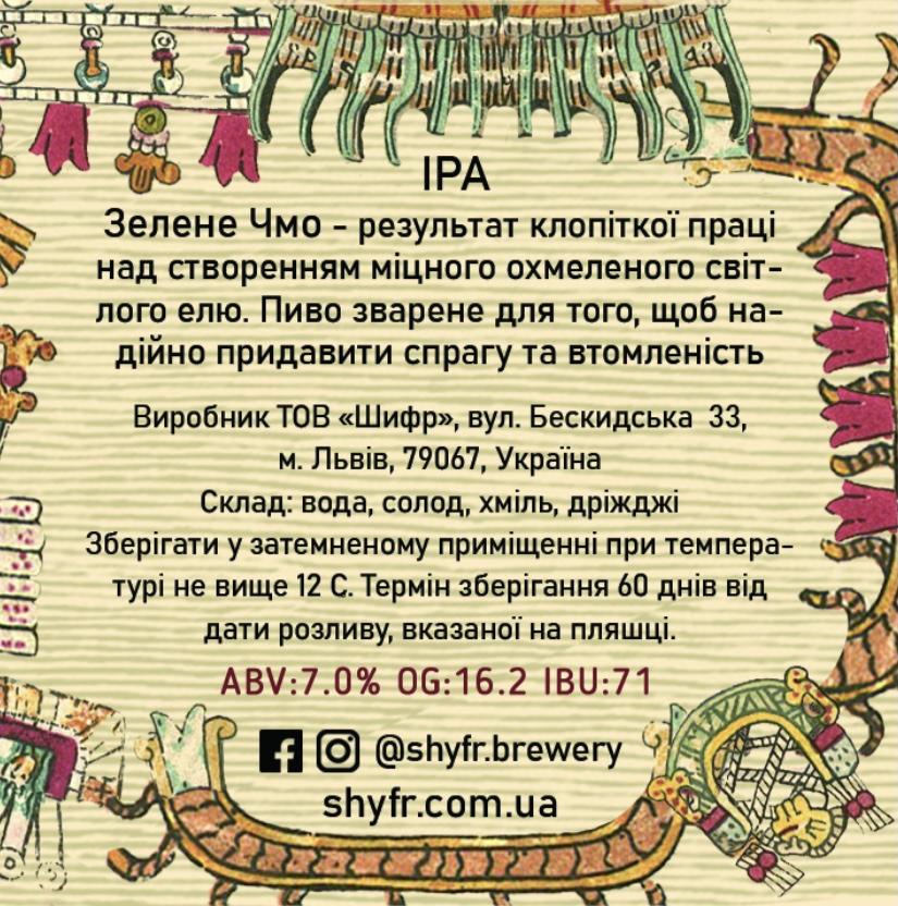 У описі на сайті броварні вказано наступне: Найкращий представник у стилі IPA. Зелене чмо – результат клопіткої праці над створенням міцного охмеленого світлого елю. Смак насичений, солодовий, збалансований гіркими хмелями Simcoe та Citra.