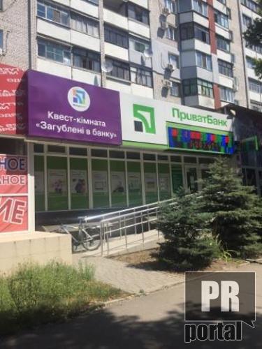 Поряд з вивіскою ПриватБанк повісили вивіску квест-кімната "Загублені у банку" з логотипом Привата