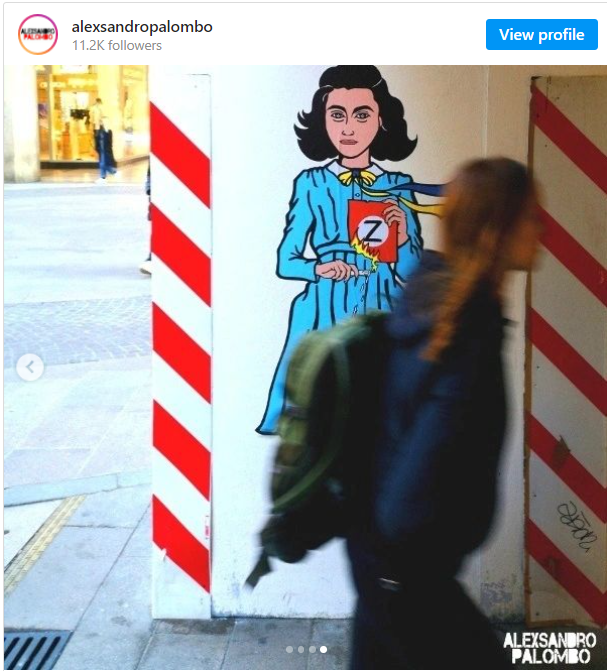На вулицях Мілана з’явився новий стріт-арт — на ньому зображена єврейська дівчинка, жертва Освенціма та Берген-Бельзена Ганна Франк, яка спалює символ розв’язаної росією війни в Україні.