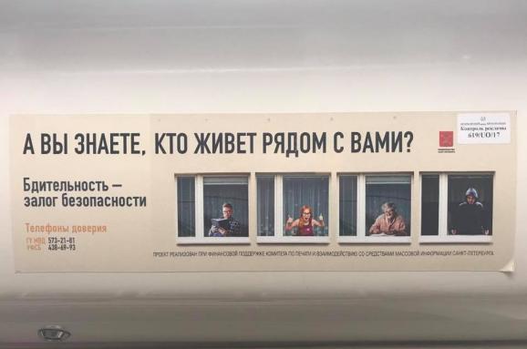 Влада Петербурга розмістила у метро соціальну рекламу із закликом придивитися до сусідів. Про це повідомляє Tjournal.