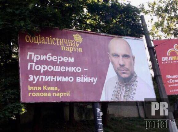Лідер Соціалістичної партії Ілля Кива, котрого повязують з міністром внутрівшніх справ Арсеном Аваковим, розпочав бордову кампанію, котра співпадає з ритирикою російської пропаганди. Як повідомляє PRпортал, на бордах розміщено слоган "Приберем Порошенко - закінчимо війну!". Таким чином, нав'язується думка, що війну розпочав український Президент Петро Порошенко, а не російський Володимир Путін. За нашими даними в деяких областях ці борди охороняють представники поліції.