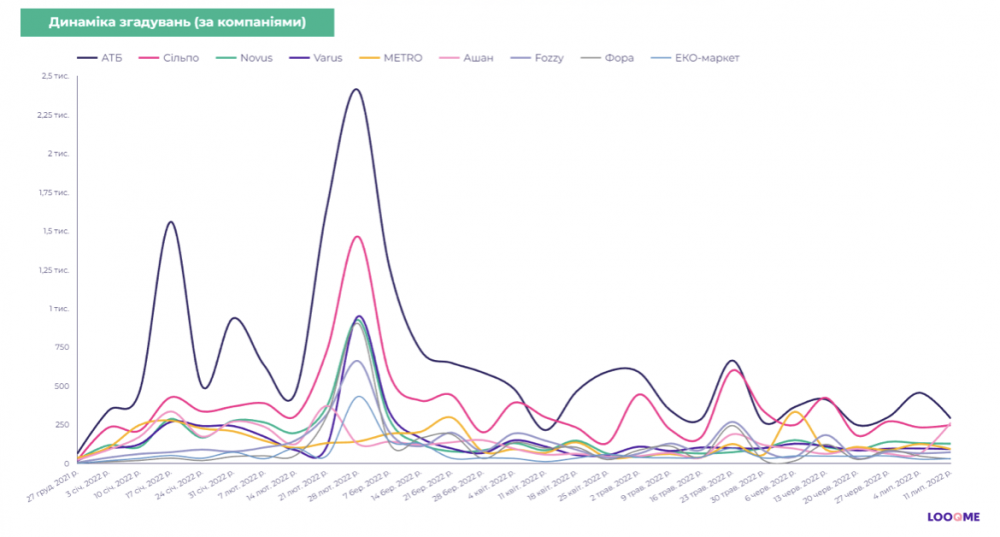 Лідером за кількістю згадувань за весь період стала мережа супермаркетів АТБ. Магазин займає третю частину медіаполя за кількістю публікацій та 41% потенційного охоплення.