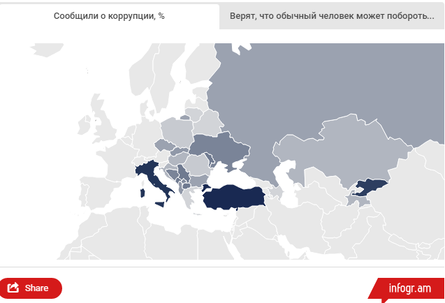 Самые нетерпимые к коррупции жители Франции и Португалии. Сообщать о фактах взяточничества там готовы 74 и 78% соответственно. В Черногории, Беларуси, Украине, Венгрии, Хорватии, Болгарии, Литве, Армении, России, Боснии и Герцеговине проинформировать компетентные органы о взятках готовы от 10 до 17% населения.