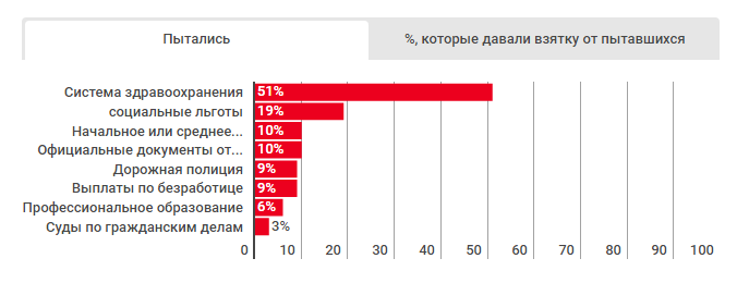 Непосредственное отношение к коррупции имеют более 60% госслужащих, парламентариев, работников налоговой сферы, судей, сообщили респонденты. Коррумпированность президента и премьер-министра признали 60% опрошенных. Давали взятки при взаимодействии с органами власти в течение последнего года 38% наших сограждан. Чаще всего украинцы платили при получении услуг в начальных и средних учебных заведениях (38%), медицинских учреждениях (33%), при взаимодействии с дорожной полицией (33%), в системе профессионального образования (31%), оформляя выплаты по безработице (9%) и социальные льготы (6%).