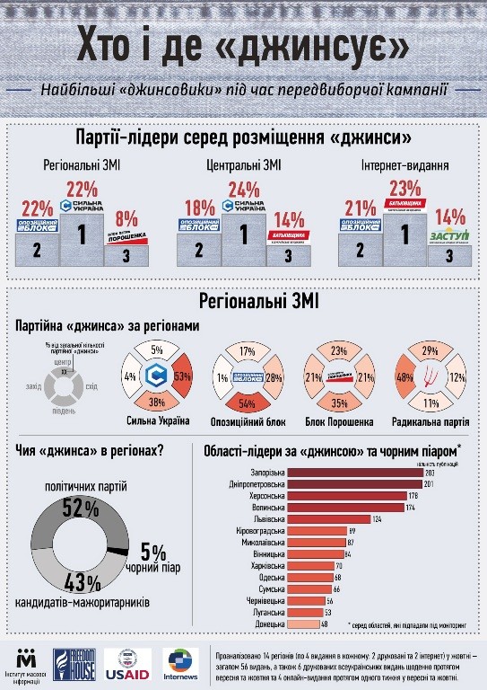 Основними замовниками прихованої політичної реклами в загальноукраїнських друкованих ЗМІ стали «Сильна Україна» (27% від всіх замовних матеріалів), «Опозиційний блок» (20%) та «Батьківщина» (16%), «Свобода» (9%), «Народний фронт» (8%). Такі результати дослідження Інституту масової інформації, що проводилось в Києві та 14 регіонах країни в період передвиборчої кампанії, було оголошено на прес-конференції в Києві 23 жовтня.