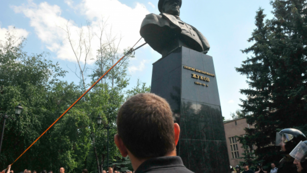 Протестующие заявили, что бюст нарушил закон Украины, запрещающий коммунистическую символику, и под приветственные крики сотен демонстрантов, огромный бюст советского военного героя маршала Георгия Жукова стянули с высокого постамента.