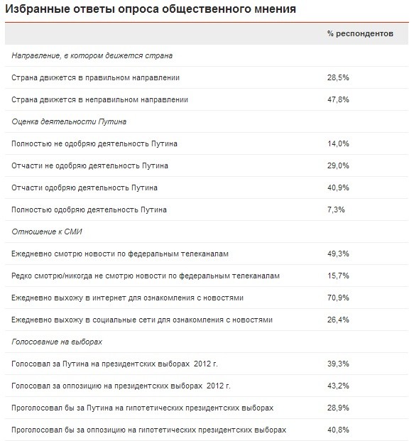 В этой статье использованы результаты опроса общественного мнения, проведенного в октябре 2013 года, за месяц до выборов московского мэра, в столице и других городах России с населением 1 млн жителей и больше. Организаторов опроса интересовало мнение респондентов в возрасте от 16 до 65 лет, имеющих высшее образование, средний (и выше среднего) достаток и доступ к интернету – то есть таких, кого можно было охарактеризовать как социально и политически активных. Хотя их опрос и не отражает полную картину общественного мнения в стране, он был рассчитан на выявление факторов, которые влияют на действия и поведение тех россиян, которые, скорее всего, находятся в оппозиции к режиму. Так, в таблице показано, что лишь 48,2% респондентов отчасти или полностью одобряют деятельность Путина на посту президента, и только 39,3% сказали, что проголосовали за него на выборах 2012 года.