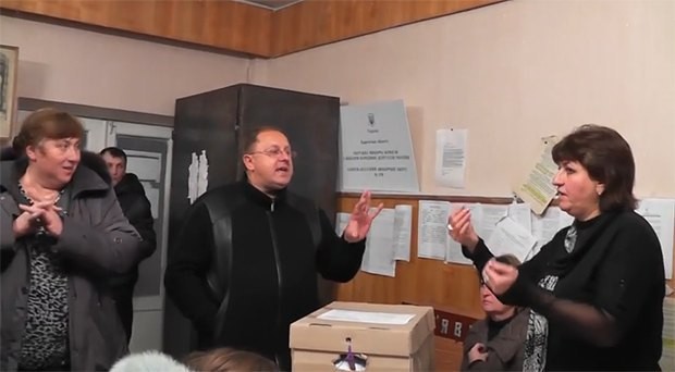 На этом приключения «зеленых человечков» на округе не закончились. Вооруженные люди в день голосования проникли, как минимум на три избирательных участка. На одном из них, как и в Лозовском горсовете, угрожая оружием, заставили уничтожить видеозапись с их участием, снятую наблюдателями.
