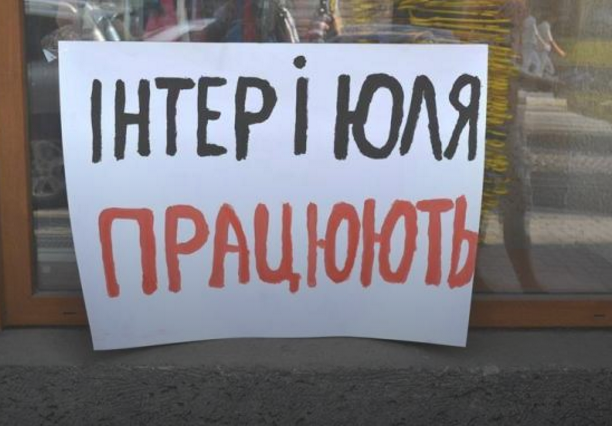 Пригадали пікетувальники Юлії Володимирівні і "любов" до російськомовного "Інтера", вивісивши під обласним штабом плакати з написом "Інтер і Юля працюють".