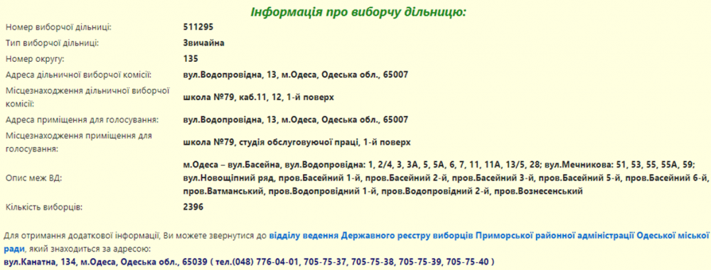 Перший крок – з’ясовуємо номер та адресу вашої виборчої дільниці. Для цього заходимо на сайт Державного реєстру виборців за цим посиланням та заповнюємо нехитру форму, де вказуємо назву населеного пункту та адресу, за якою ви прописані. Припустимо, що ви виборець, який проживає за адресою: м. Одеса, Приморський район, вул. Басейна, 6а. База оперативно видає нам наступну інформацію: про адресу дільниці, розташування приміщення для голосування та опис меж виборчої дільниці. Скоріш за все, саме цією дільницею ви користувались на попередніх виборах.