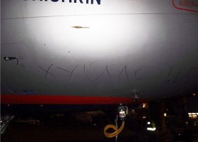 В аеропорту "Бориспіль" у Києві кілька співробітників розмалювали літак "Аерофлоту", який збирався відлітати до Росії, матірною кричалкою про Путіна.