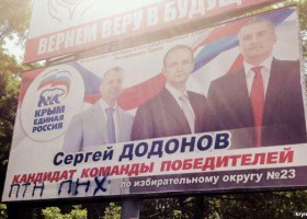 В аннексированном Симферополе на одном из билбордов, рекламирующих участника предвыборной гонки от «Единой России», неизвестные написали черной краской знаменитую аббревиатуру «ПТН ПНХ».