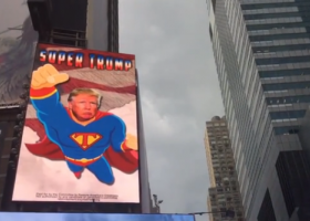 На одном из рекламных экранов в центре Нью-Йорка начали показывать ролик, на котором кандидат от республиканцев Дональд Трамп изображен в облачении Супермена.