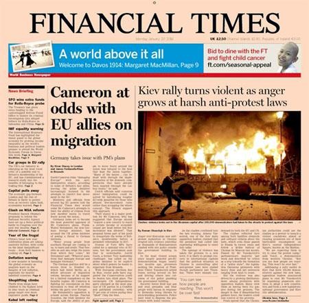 Впливове британське видання Financial Times надрукувало свіжий номер за 20 січня, де на першій шпальті опинилася стаття про сутички у Києві.