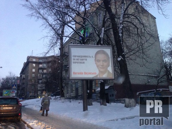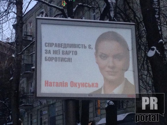 "Справедливість є, за неї варто боротися" - решила не долго думать Наталия Окунская и позаимствовала для своих предвыборных билбордов лозунги экс-шефини экс-мужа.