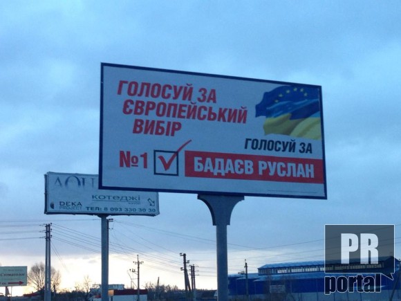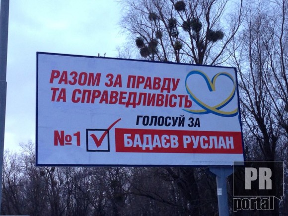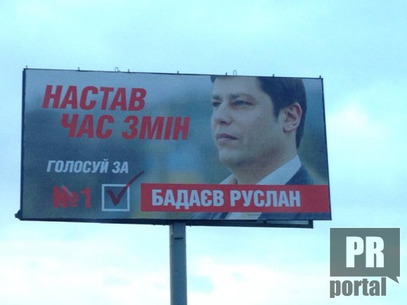Один из самых активных уничтожителей местных пейзажей – провластный Руслан Бадаев - «спер» у оппозиции не только цветовую гамму (и не только у оппозиции) но и немножко лозунгов. Видимо, руководствуясь принципом «везде по чуть-чуть и нигде ничего», политтехнологи этого кандидата «настрочили» разношерстных билбордов.